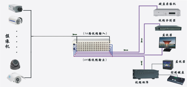 功能简介 输入十六路视频信号,各分配出四路(共六十四路)视频信号输出。